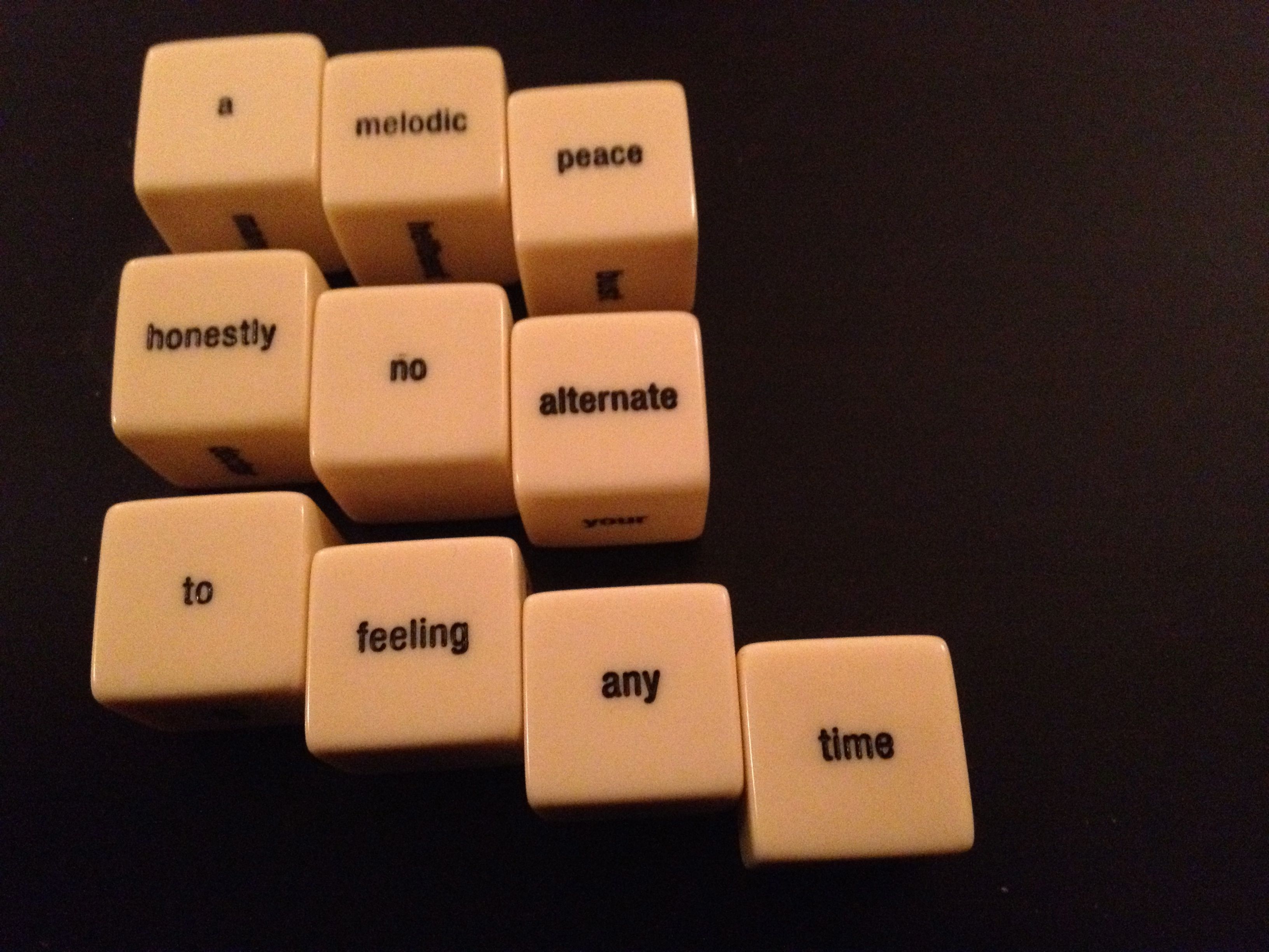 Haikubes are a small collection of blocks you can use to write haiku. You can roll two inspiration dice and write on that theme. My friend Jay Marie and I recently played around with these. Here’s what I came up with when I rolled [ die 1 ] and [ die 2 ]:
